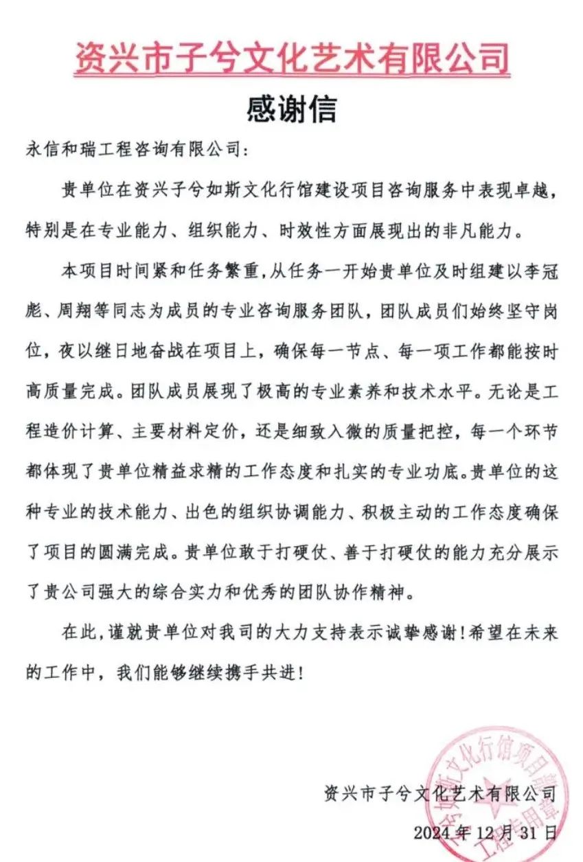 資興市子兮文化藝術(shù)有限公司對大灣區(qū)深圳分公司所提供的服務(wù)給予高度評價(jià),對我司在專業(yè)能力、組織能力、時(shí)效性方面展現(xiàn)的非凡能力表示贊賞,并對我司的大力支持表示誠摯感謝。未來我司將在造價(jià)咨詢這一傳統(tǒng)優(yōu)勢領(lǐng)域繼續(xù)深耕,延續(xù)一以貫之的硬實(shí)力、高水準(zhǔn),進(jìn)一步在更多不同地區(qū)擴(kuò)展業(yè)務(wù)版圖。