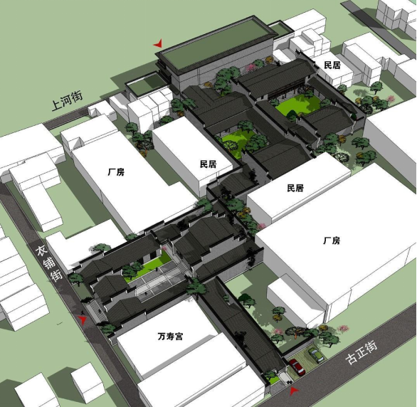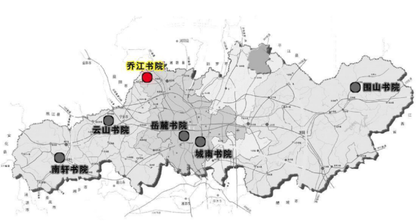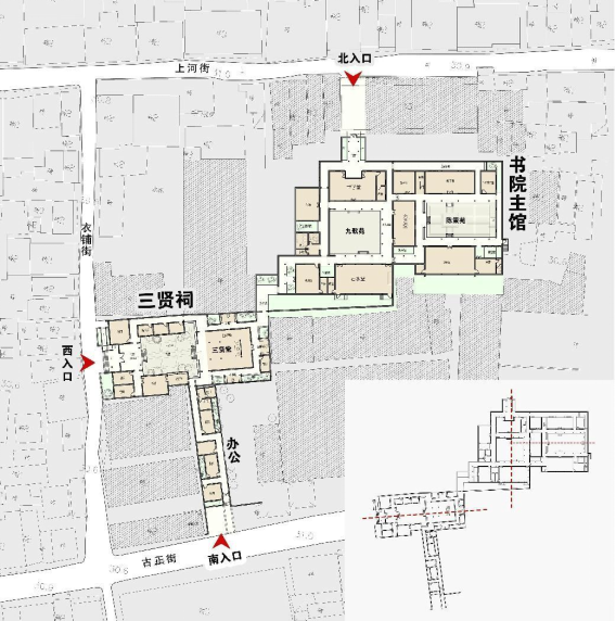 書院主館以方庭(九歌苑)為核心,配置世學堂、若水堂、六藝館,陳策苑、藏書閣、迎客軒等書院空間。