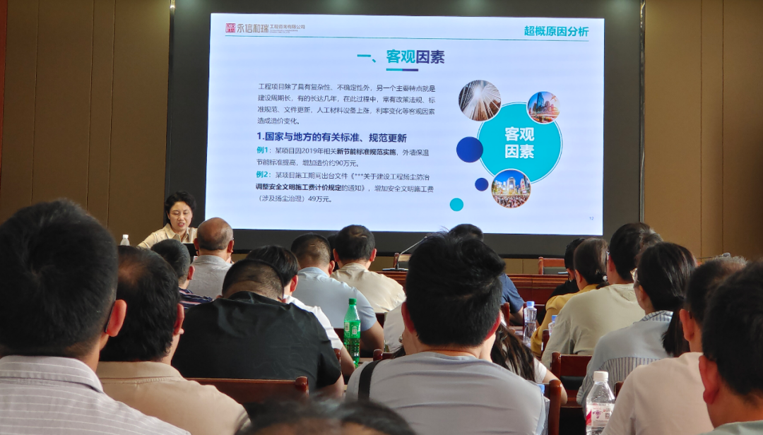 培訓由永信和瑞項目管理咨詢部總經(jīng)理黃浩浩主講。她以“政府投資項目超概原因分析及控制措施”為主題,結合豐富的案例和翔實的數(shù)據(jù),從多個角度抽絲剝繭,深入分析了導致超概的原因。她指出,因工程項目的不確定性,超概原因既有客觀層面的,但更多是因缺乏整體管控思路、管理不善造成的。接著,黃總進一步從監(jiān)管層面和操作層面提出了多項控制措施。她認為,對于政府層面而言,有必要出臺詳細的、切實可行的政策文件,用以規(guī)范管理、壓實各方責任;對于建設單位而言,必須在整體管控的框架下開展工作,作為游戲規(guī)則的制定者,要將主動權把握在自己手上。最后,黃總提出,讓所有的參建單位均以實現(xiàn)項目增值為目的,共同確定和追求項目的整體目標,確保參建各方都能獲取應有的利益,共創(chuàng)多贏局面,實現(xiàn)正和博弈,這便是我們作為咨詢?nèi)说氖姑A得了在場學員的高度評價。