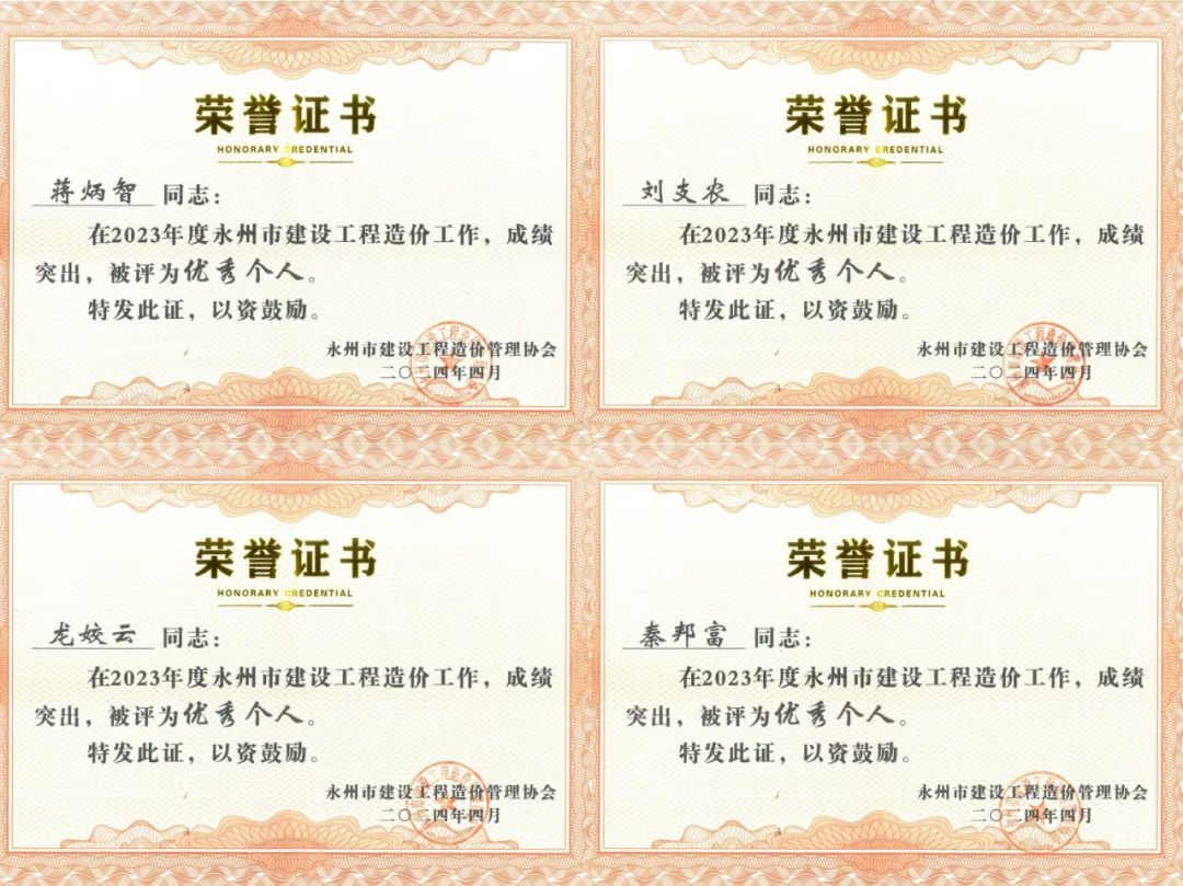 ????在剛剛結束的2023年度永州市建設工程造價工作中,我公司四位杰出的同事——龍姣云、蔣炳智、泰邦富和劉支農,憑借在各自崗位上的出色表現,榮獲“2023年度優秀個人會員”。