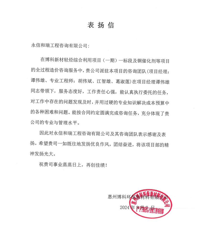 8月7日,我司派駐博科新材輕烴綜合利用項目(一期)一標段及銅催化劑等項目進行全過程造價咨詢服務的項目經理譚偉雄,專業工程師胡偉斌、江智雄、葛淑蓮圓滿完成咨詢服務,收到了來自惠州博科環保新材料有限公司的表揚信。